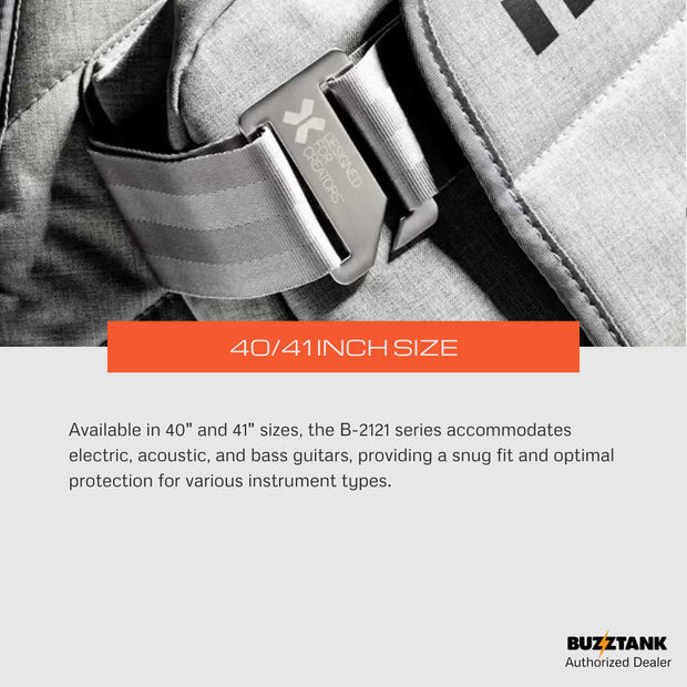 The **Jinchuan B-2121 30mm Padded Oxford Cloth Acoustic Guitar Bag 41", Black (Model: GU-B2121-AC41-BL/GR)** is tailored for acoustic guitars, specifically those measuring up to 41 inches. This bag shares the high-quality features seen in the electric guitar variant, providing robust security and transportation ease for acoustic guitars. The sturdy straps and convenient handle make it perfect for musicians who frequently travel to gigs or practice sessions.