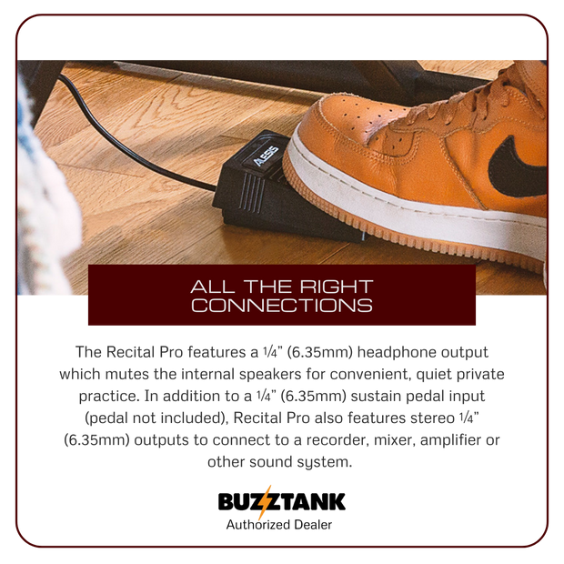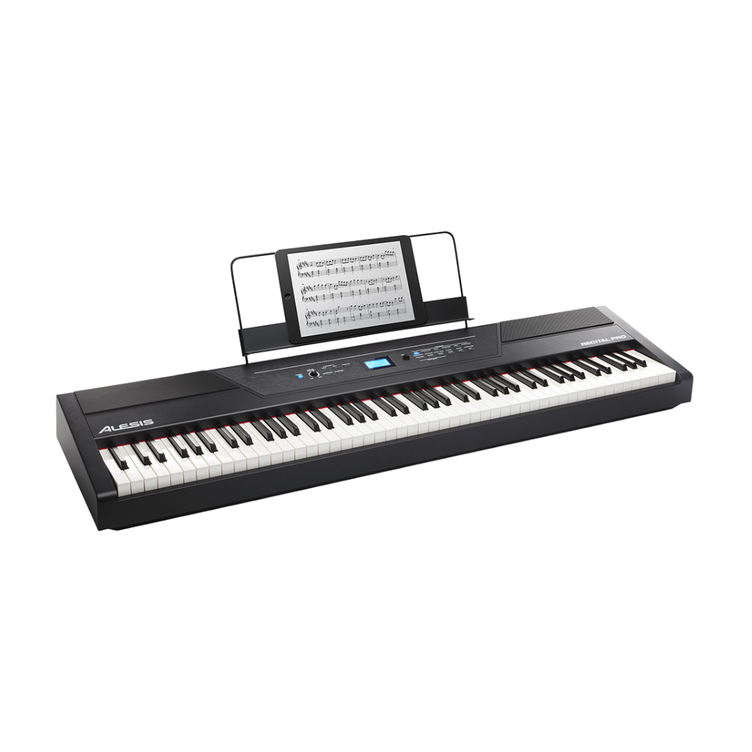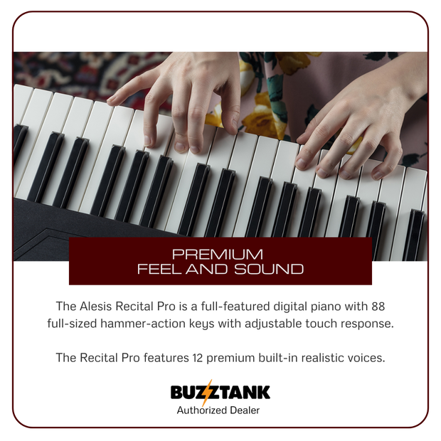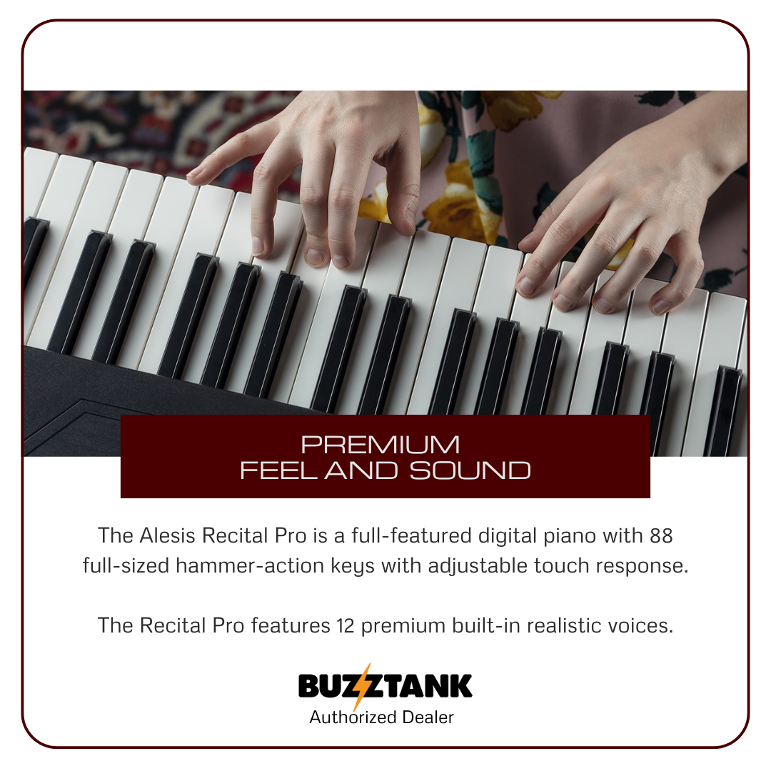 The Alesis Recital Pro is a top-rated digital piano, widely praised for its premium feel and sound, making it one of the best budget-friendly options for beginner pianists. Featuring 88 full-sized hammer-action keys with adjustable touch response, the Recital Pro offers an authentic and dynamic playing experience. It comes with 12 premium built-in voices, including classic options like Acoustic Piano, Electric Piano, Organ, Strings, and Bass, among others. You can layer two voices together or split them between your left and right hands for more versatility. With powerful 20-watt speakers and a 128-note maximum polyphony, the Recital Pro delivers high-quality, realistic sound for a true piano experience.