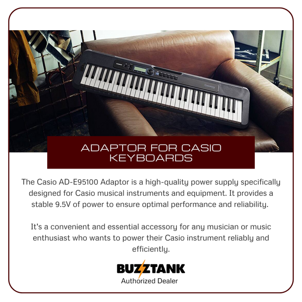 The Casio AD-E95100 is a reliable power supply adapter designed specifically for Casio electronic instruments. It provides a steady and consistent 9.5V output, ensuring that your Casio keyboard, digital piano, or other compatible devices run smoothly. Whether you're practicing at home, performing, or recording, this adapter ensures your instrument has the power it needs for optimal performance.