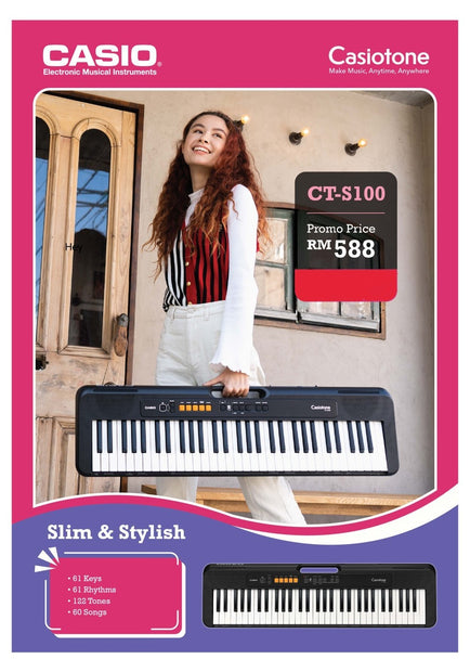 The Casio CT-S100 is a sleek, portable keyboard that offers a blend of convenience, quality sound, and easy-to-use features. Ideal for musicians who want a compact instrument for practice or performance, the CT-S100 is perfect for both beginners and casual players.