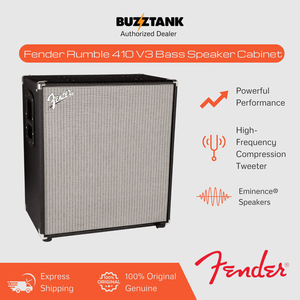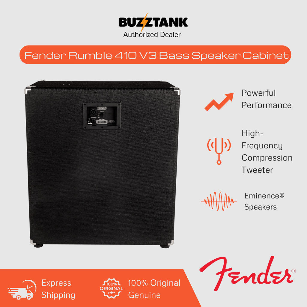 The Fender Rumble 410 V3 Bass Speaker Cabinet is a robust and powerful accessory designed for bass players seeking a rich and resonant sound. This cabinet is part of Fender's renowned Rumble series, known for its innovative design and high-quality performance suited for various playing environments. The Rumble 410 V3 is perfect for both practice and live performances, delivering clarity and depth that enhance the bass experience.