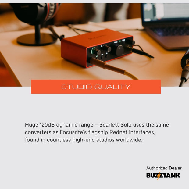 The Focusrite Scarlett Solo 4th Gen is a high-quality, 2-in/2-out USB audio interface that offers exceptional performance for solo musicians, podcasters, and creators. Designed for simplicity and pristine sound quality, the Scarlett Solo provides the essential features needed for capturing professional-grade audio in a compact form factor.