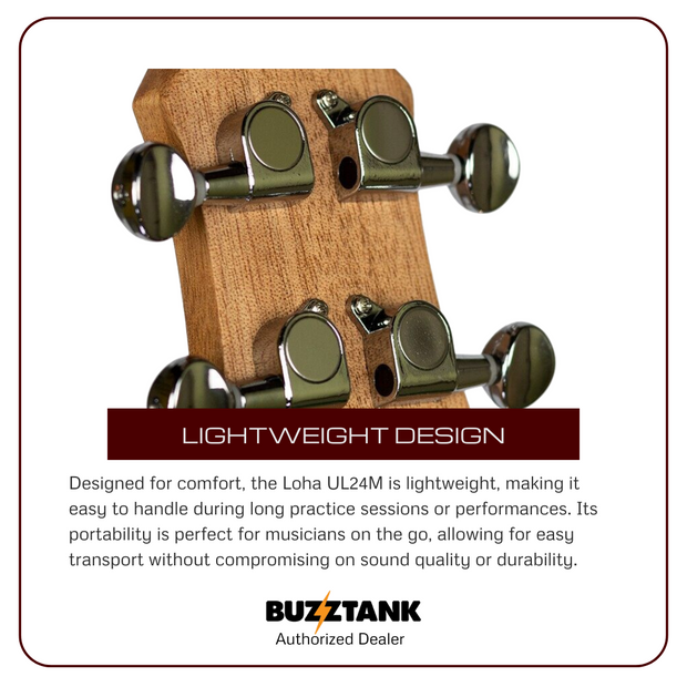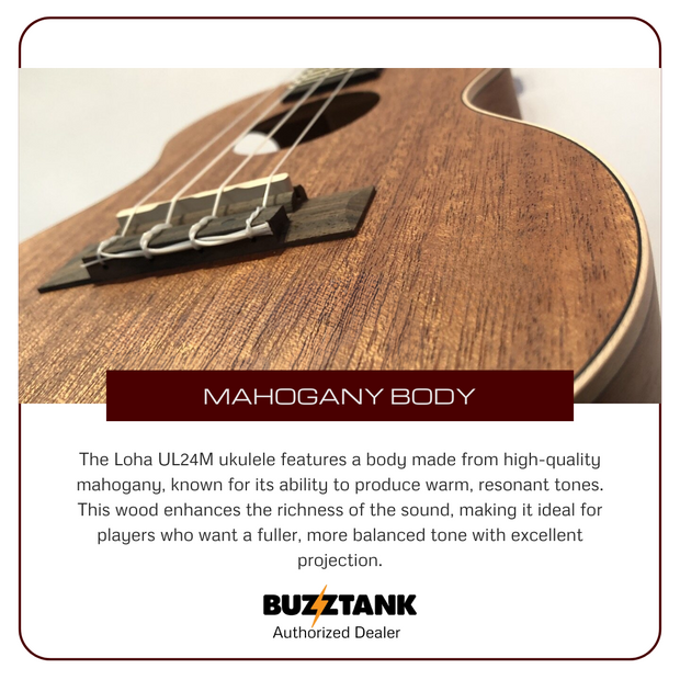 The LOHA UL24M Concert Ukulele is expertly crafted to offer a perfect blend of durability, sound quality, and portability, making it an ideal choice for ukulele players of all levels. Its high-quality laminated mahogany construction provides excellent strength and resilience, making it suitable for frequent use and travel.