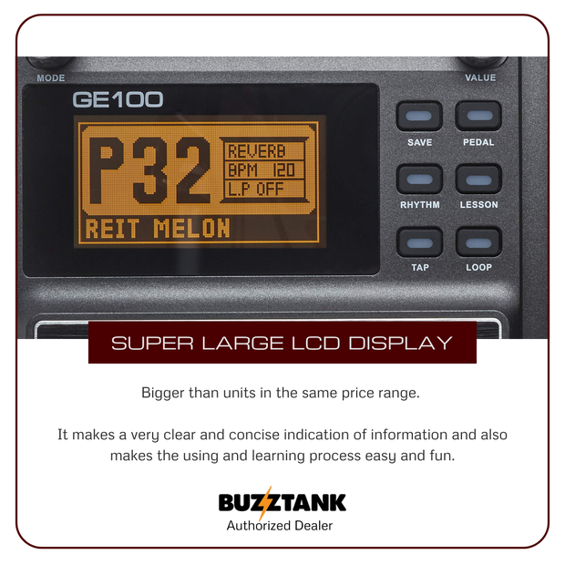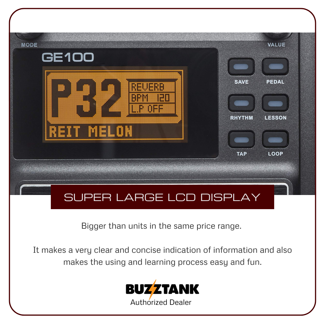 Whether you're experimenting with new sounds, practicing scales, or jamming along with rhythms, the GE100 provides everything you need to elevate your guitar playing experience.