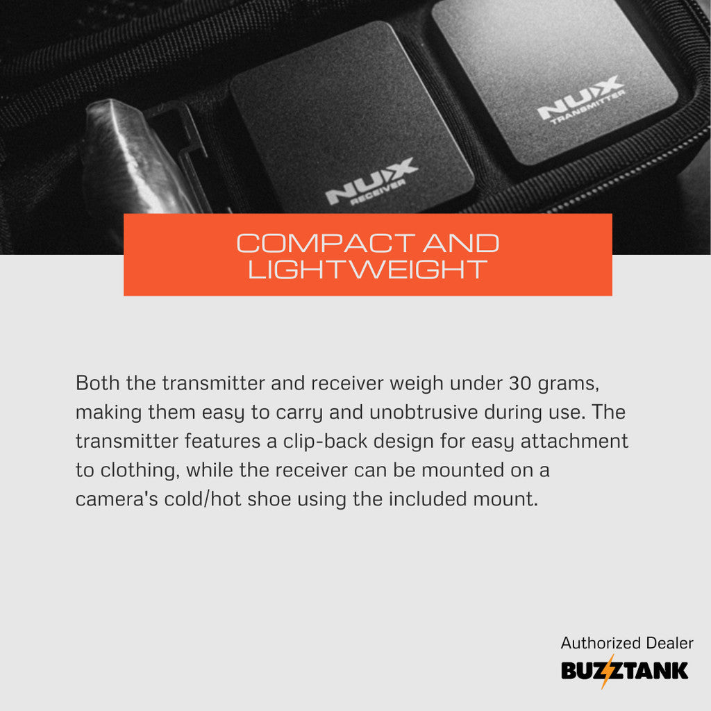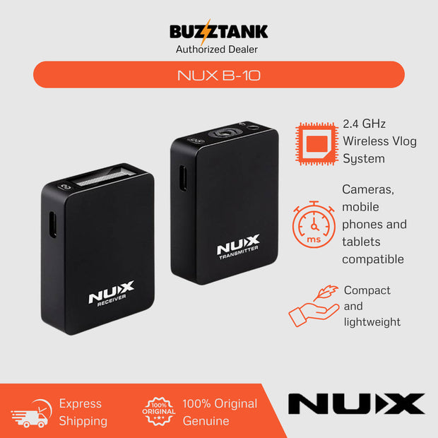 The NUX B-10 is a wireless guitar system designed to deliver a seamless and cable-free audio experience for musicians seeking freedom on stage. Compact and highly portable, this system is a perfect solution for guitarists who want to eliminate cable clutter and move freely without compromising their sound quality. The NUX B-10 is engineered with the modern musician in mind, ensuring both performance reliability and ease of use.