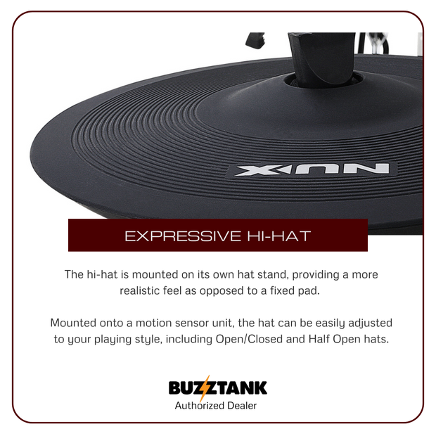 Expressive Hi-Hat: Unlike fixed pads, the hi-hat is mounted on its own stand, offering a more realistic experience. The hi-hat can be easily adjusted to your playing style, supporting Open, Closed, and Half-Open positions. This allows for precise and dynamic control over your hi-hat playing.