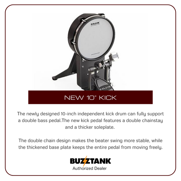 10" Kick Drum with Double Bass Pedal Support: The 10" independent kick drum is designed to accommodate double bass pedals, making it ideal for drummers who play more advanced techniques. The new kick pedal has a double chainstay for smoother, more stable motion, and a thicker soleplate to prevent the pedal from moving during performance.