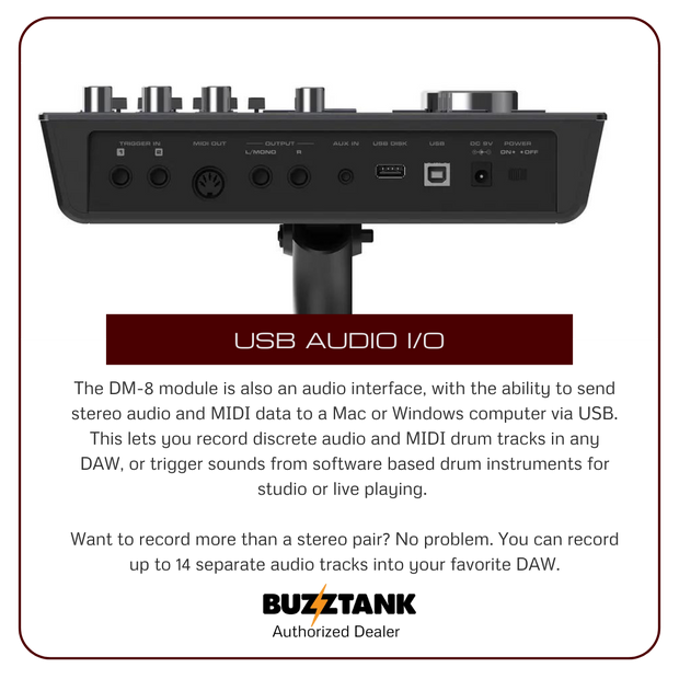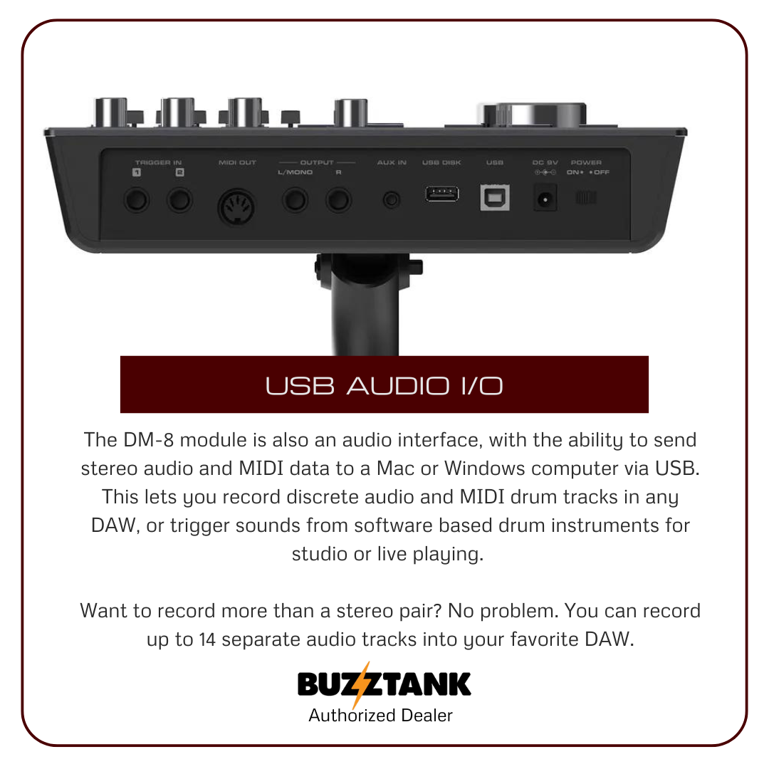 USB Audio I/O: The DM-8 doubles as an audio interface with USB connectivity, allowing you to send stereo audio and MIDI data to your computer. This feature is perfect for recording discrete audio tracks in a DAW or triggering sounds from software drum instruments. You can even record up to 14 separate audio tracks for more detailed recording options.