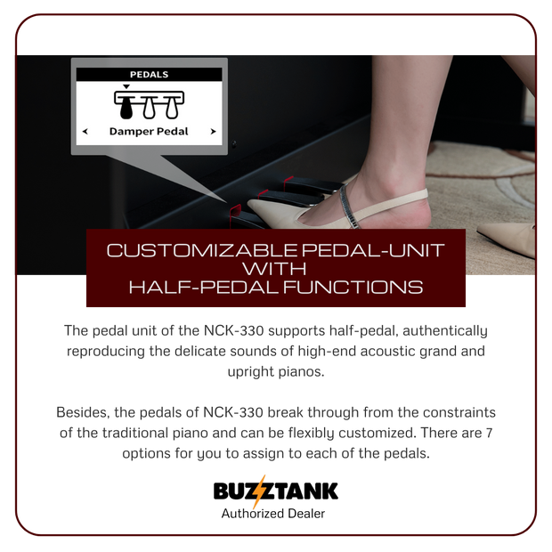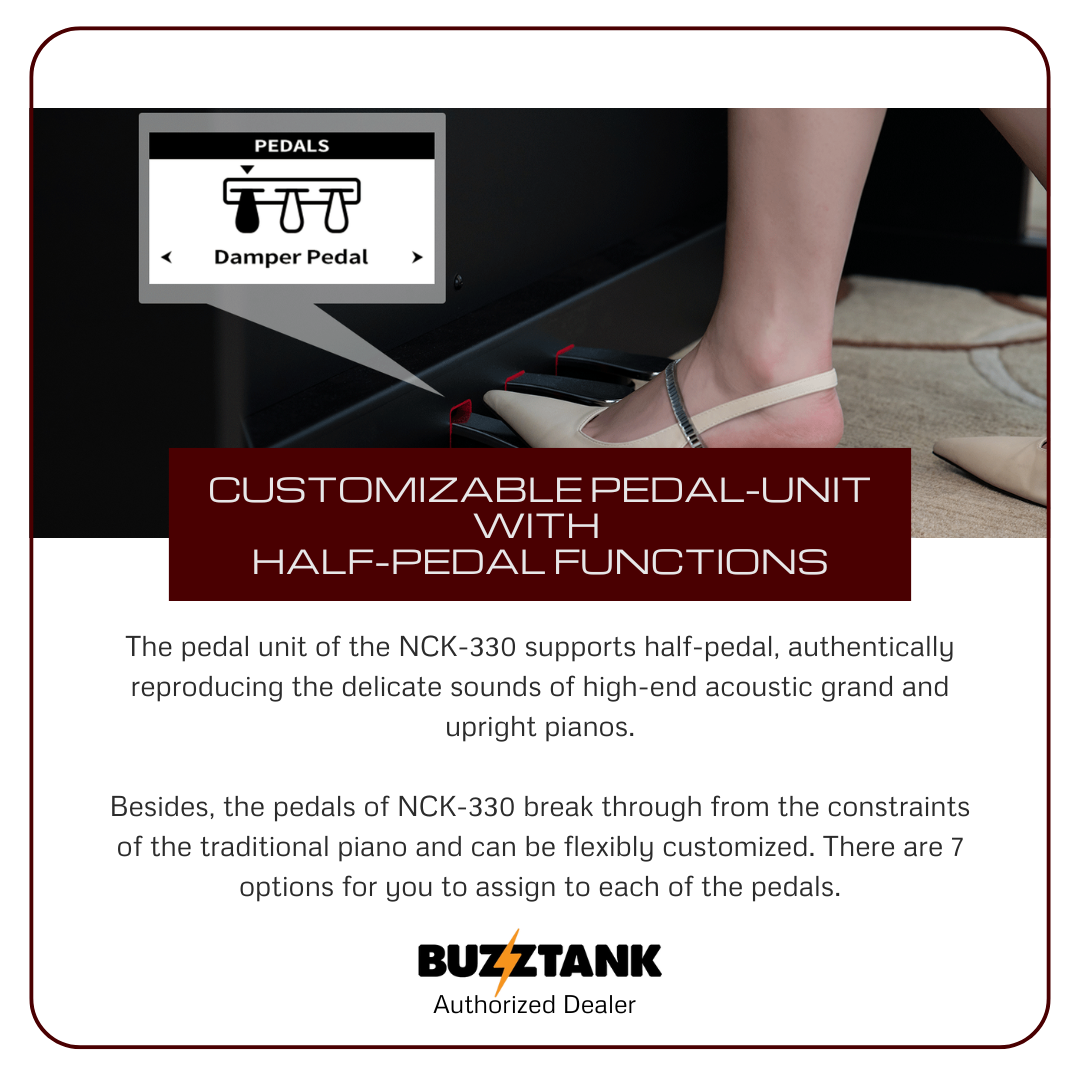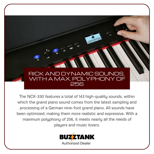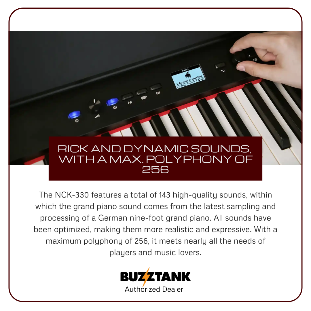 The NCK-330 features a full 88-key keyboard, offering the same range and feel as a traditional acoustic piano. The keys are touch-sensitive, allowing for a dynamic playing experience that responds to the strength and nuances of your touch.