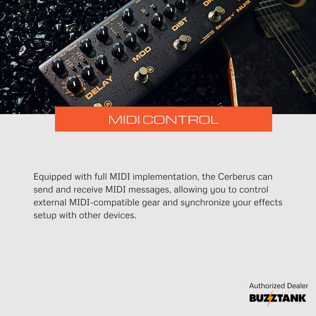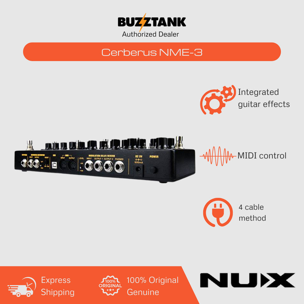 In addition to these features, the Cerberus includes MIDI functionality, enabling seamless integration with other MIDI-equipped gear. It also supports USB connectivity for firmware updates, ensuring that it can evolve with future improvements and enhancements. The NUX NME-3 Cerberus is a powerful tool for any guitarist seeking to expand their sound palette without compromising on ease of use or tonal quality.