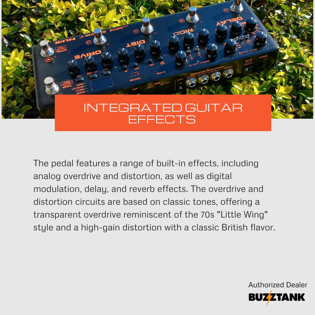 - **Versatile Effects Setup**: Combines analog Overdrive and Distortion with digital Modulation, Delay, and Reverb.