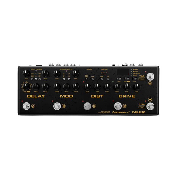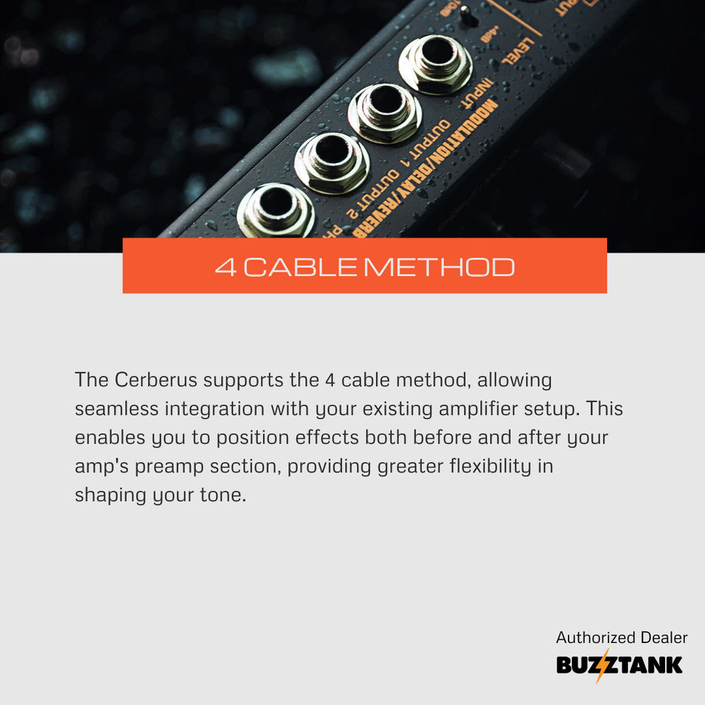 One of the standout features of the Cerberus is its hybrid design of analog and digital effects. The pedal includes essential analog effects like Overdrive and Distortion paired with digital effects such as Modulation, Delay, and Reverb. This setup allows guitarists to access a wide range of sonic possibilities, creating rich and dynamic soundscapes. It also features an impulse response (IR) loader, which is ideal for running direct to a PA system or recording interface.