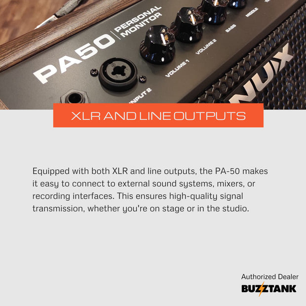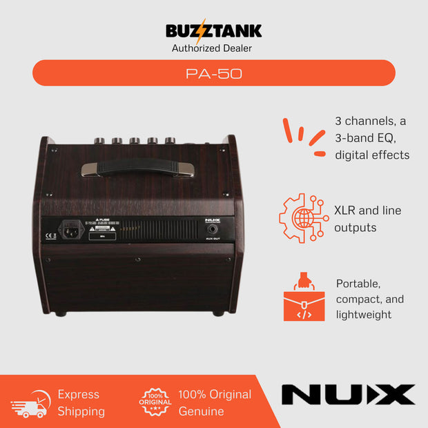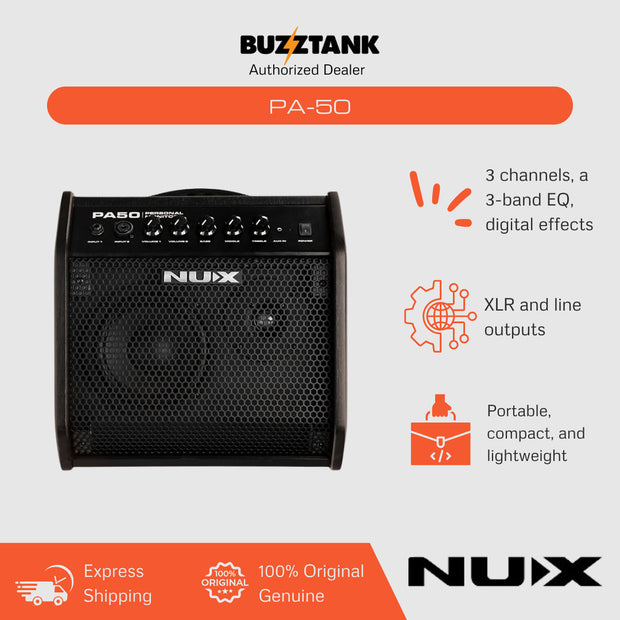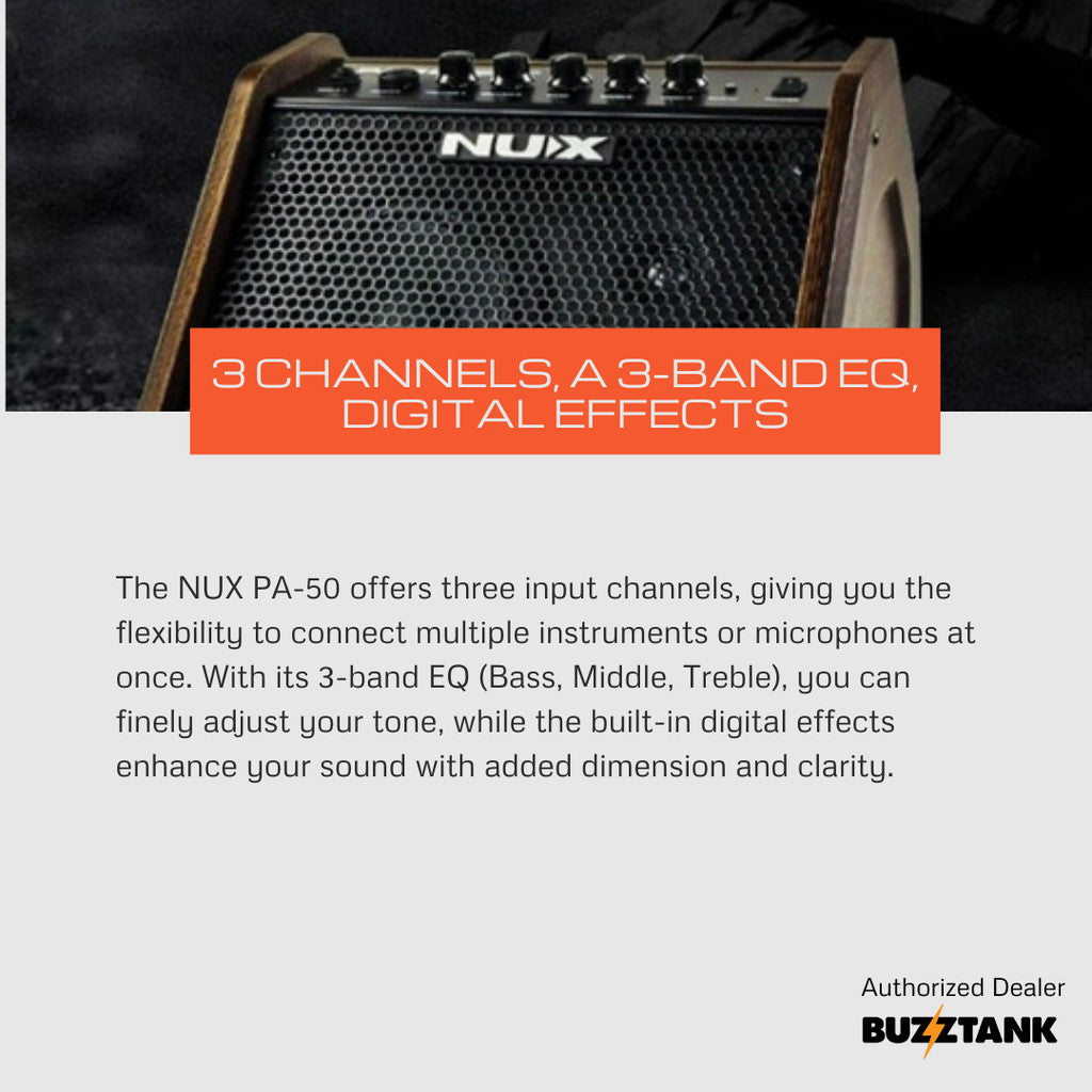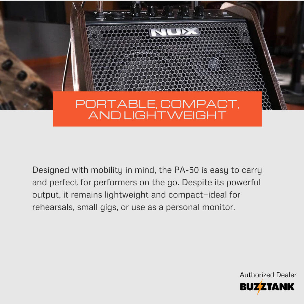 - **Power Output**: Capable of delivering up to 50 watts of power, the NUX PA-50 provides ample volume for small venues and practice sessions, ensuring clear and dynamic sound reproduction.