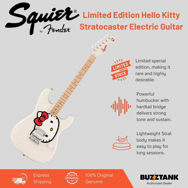 Bring a blend of style, fun, and performance to your music with the Squier Hello Kitty Stratocaster, a limited edition electric guitar designed for both collectors and players. With its unique design, reliable features, and smooth playability, this guitar is perfect for beginners, enthusiasts, and fans of Hello Kitty alike.
